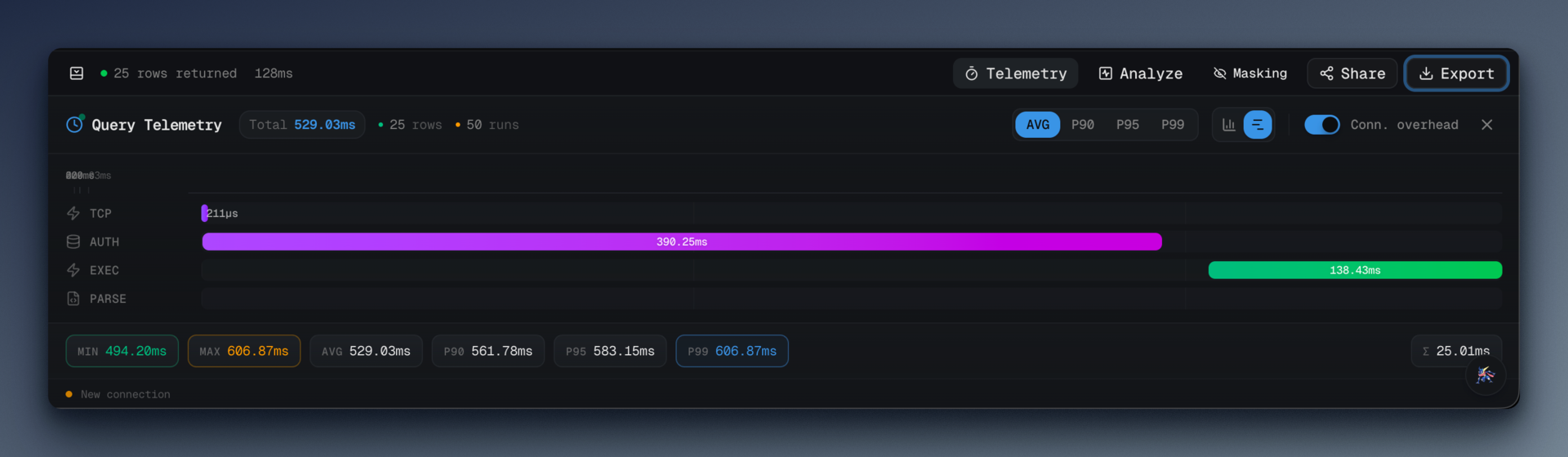 - Per-phase breakdown — connect, plan, execute, fetch — each with its own percentiles