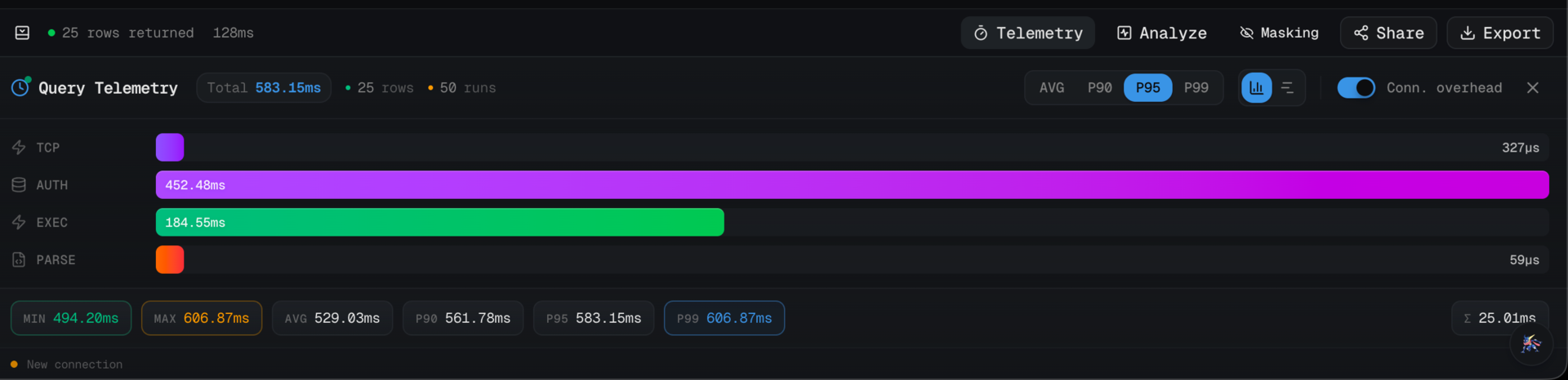 Fetch is where network latency hides. If you are running data-peek on your laptop against a remote Postgres, the fetch phase is where the round-trip tax shows up. Running the same benchmark on the same server against the same database will show you an entirely different fetch percentile. That is the real cost of remote development.